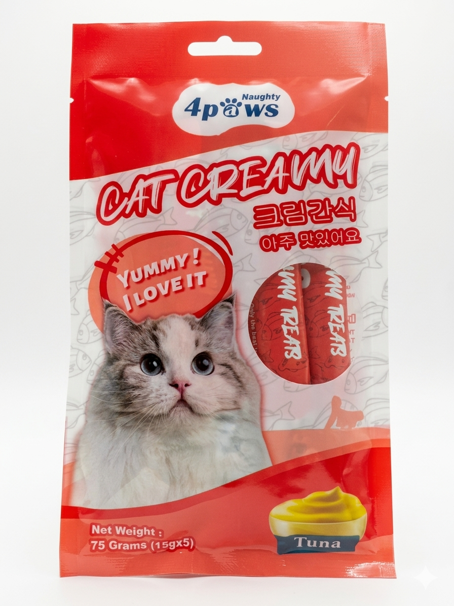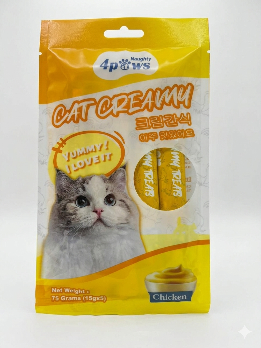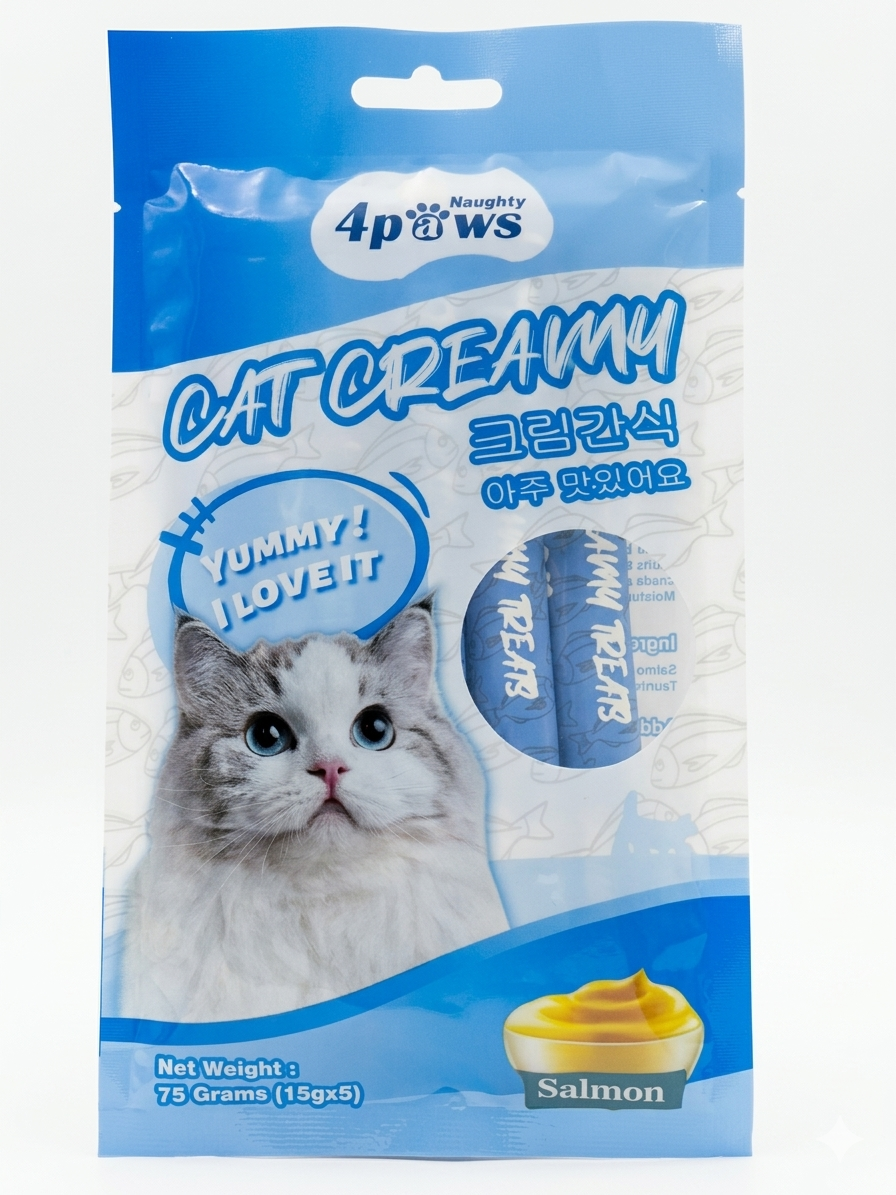 Treat your cat to Naughty 4Paws Cat Creamy, the most popular and appetizing snack for feline friends. Featuring a smooth, liquid creamy texture rich in fresh Salmon flavor, these treats can be licked straight from the tube or used as a delicious topper for dry food. Each 75g pack contains 5 individual sticks, making it perfect for bonding with your cat during playtime or training.